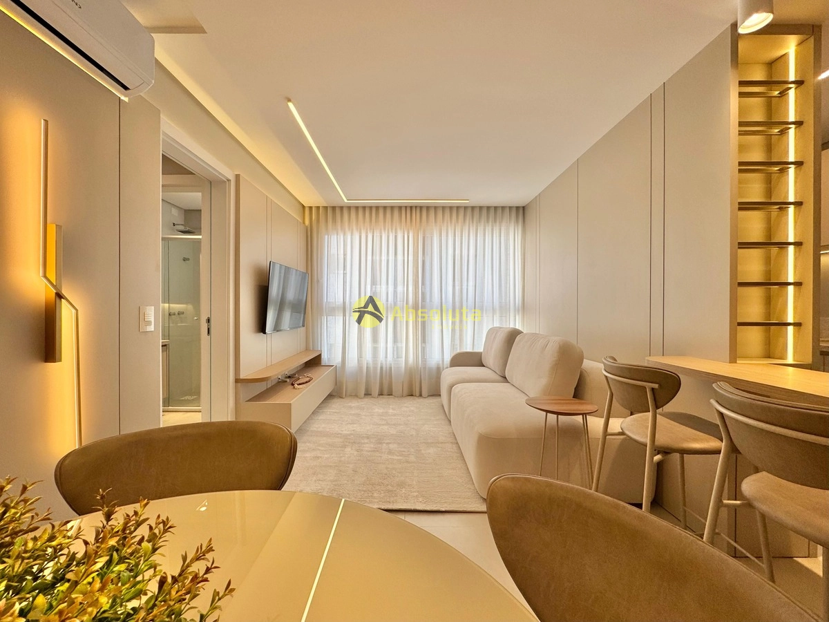 Apto 01 suíte + lavabo, mobiliado/decorado, cozinha estilo americana, lavanderia, água quente, gás central, ambientes climatizados, churrasqueira, andar alto, apto 53 m² de área privativa, amplo living 2 ambientes, box de garagem de fácil acesso, sacada lateral com vista pro mar. Edifício de alto padrão, 2 elevadores, 15 andares, com infraestrutura no rooftop(piscina infantil e adulta, academia, brinquedoteca, salão de festas, espaço gourmet externo, e telhado verde ao redor), localizado no bairro Navegantes.
