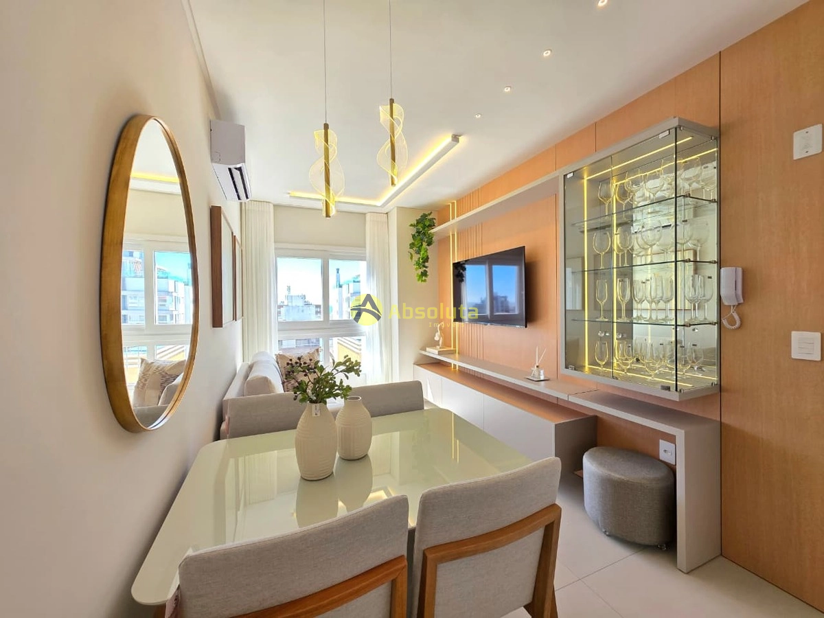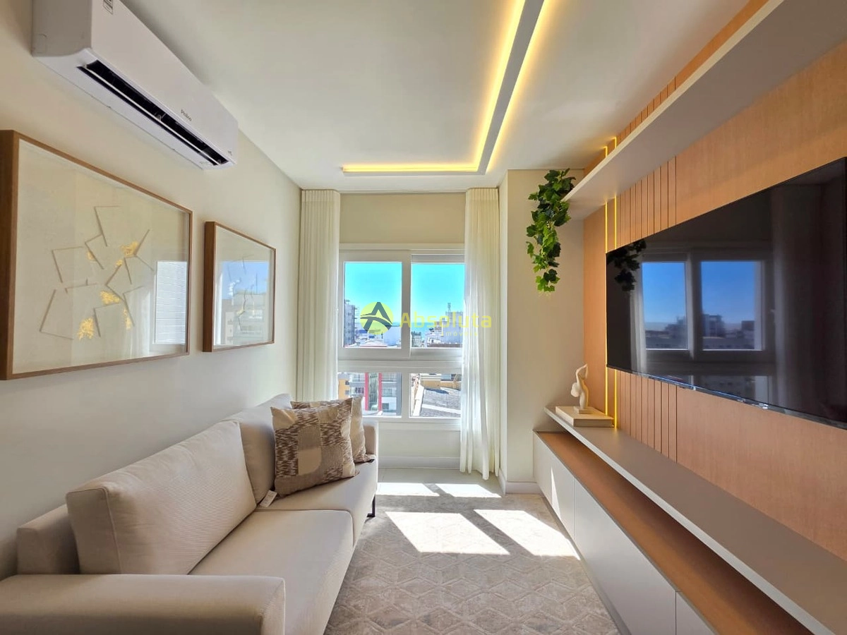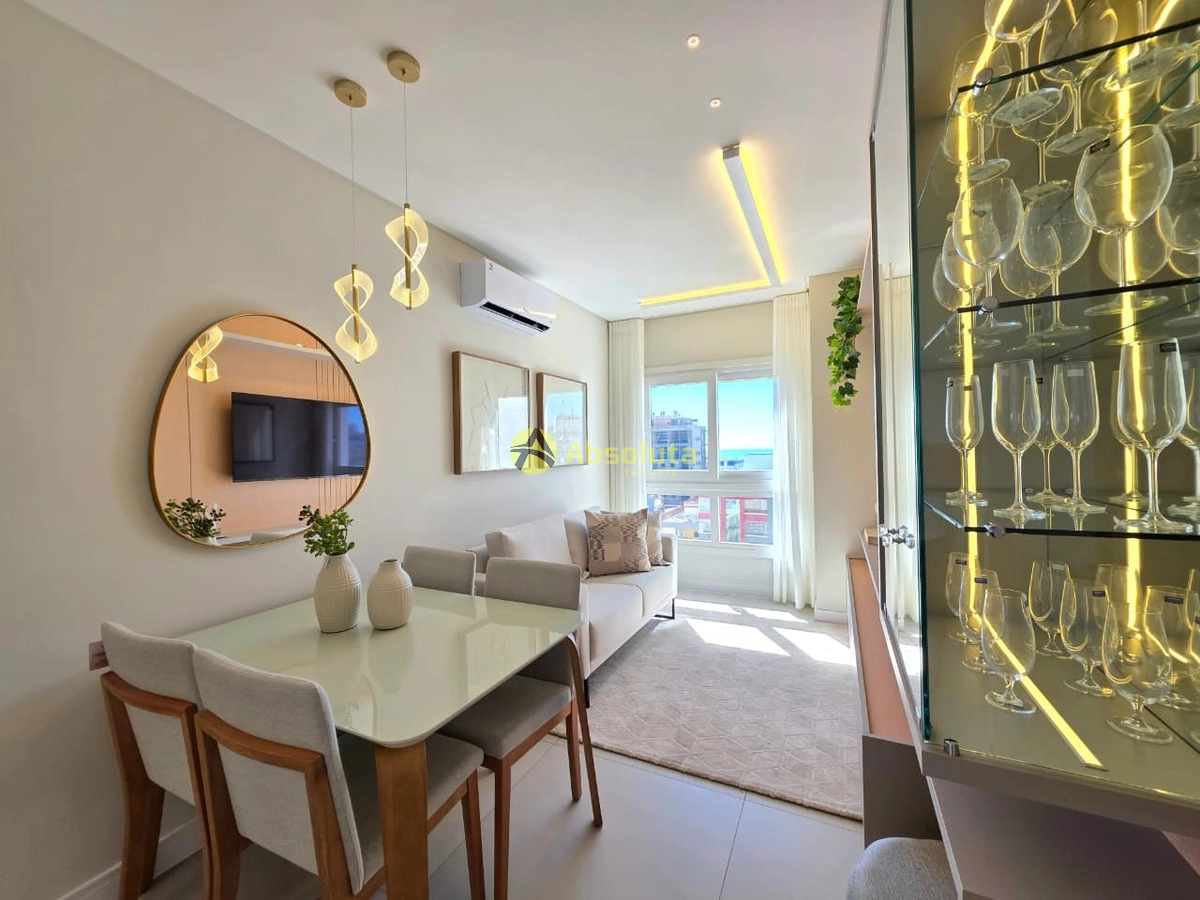 Apartamento novo, finamente mobiliado, decorado, equipado e climatizado, composto por um dormitório, banho social, cozinha americana, área de serviço separada, espaço gourmet com churrasqueira, living em 2 ambientes com sala de jantar e sala de estar, vista parcial do mar, mais um box de estacionamento.