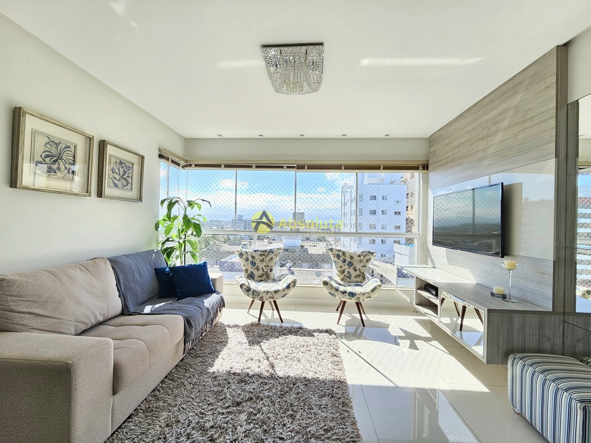 Apartamento totalmente mobiliado, equipado, composto de duas suítes individuais, lavabo, living em 2 ambientes, estar e jantar, cozinha com bancada, área de serviço separada, sacada integrada com vista para serra e praça Flávio Boianovski, água quente, gás central, e um box de estacionamento.