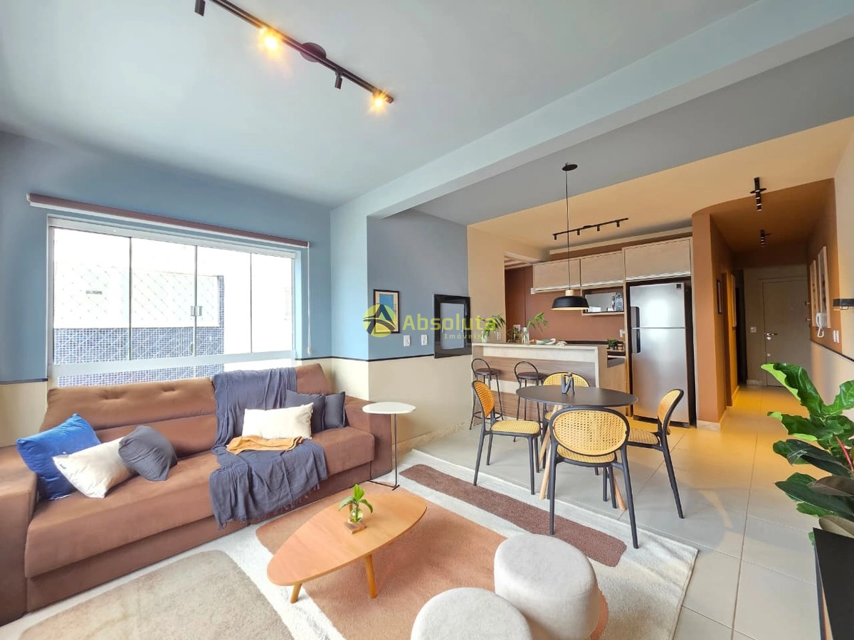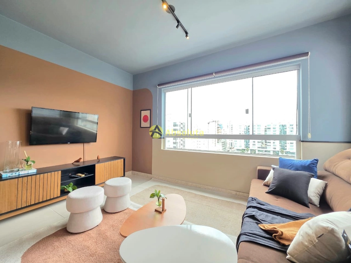 Apartamento totalmente mobiliado e equipado, composto de 2 dormitórios, um sendo uma suíte, banheiro social, living em dois ambientes, sacada integrada de frente, com vista para praça e mar, churrasqueira, cozinha estilo americana, área de serviço, e um box de fácil acesso no térreo.