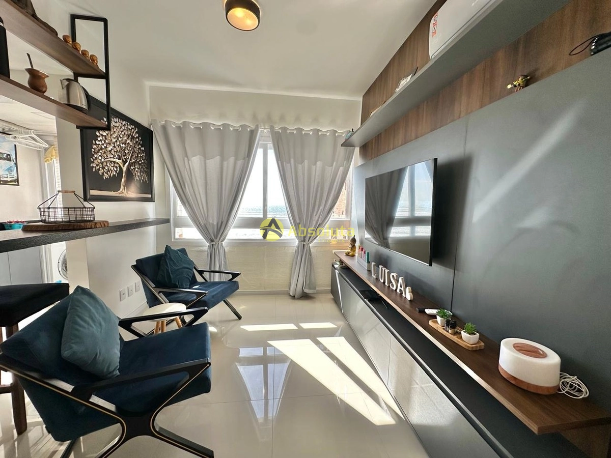 Apartamento composto por 2 suítes, lavabo, todo mobiliado, com vista para o mar e box de garagem.