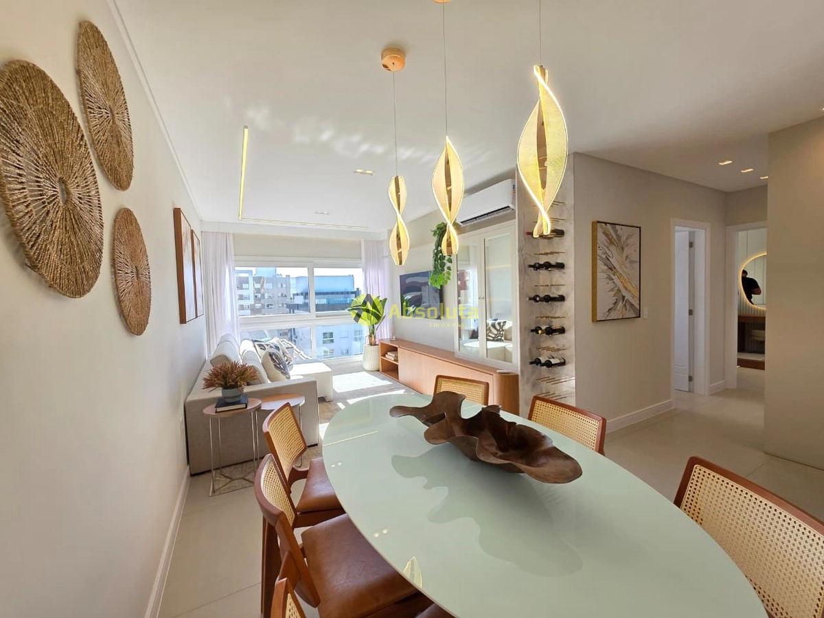 Apartamento novo, finamente mobiliado, decorado, equipado e climatizado, composto por dois dormitórios, um sendo suíte, banho social, cozinha americana, área de serviço separada, espaço gourmet com churrasqueira, living em 2 ambientes com sala de jantar e sala de estar, mais um box de estacionamento.