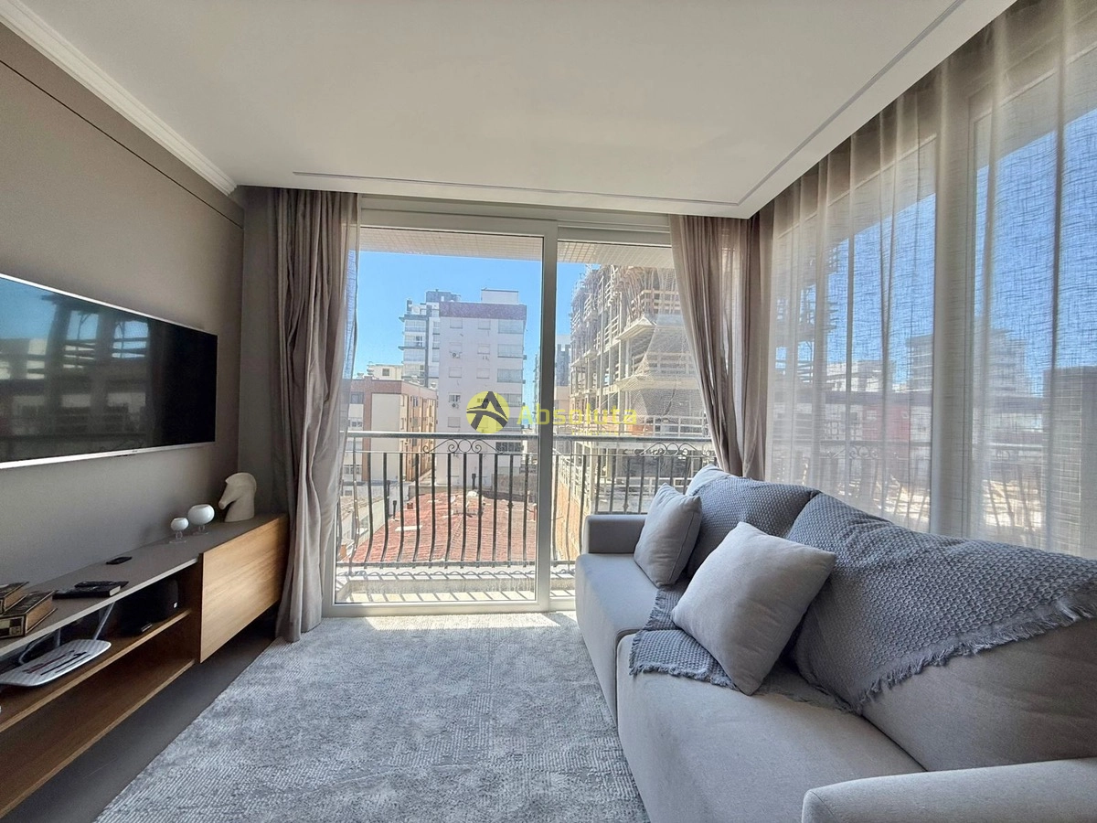 Apartamento mobiliado com excelente localização, próximo à Praça Flávio Boianovski, a duas quadras do mar e do calçadão da cidade, em região com fácil acesso ao comércio e às principais ruas. Possui dois dormitórios, sendo uma suíte, banheiro social, sacada de frente e terraço lateral, cozinha estilo americana com churrasqueira, área de serviço separada, piso em porcelanato, espera para água quente e gás central, além de rebaixo em gesso. Conta com uma vaga de garagem. Edifício em estilo neoclássico, com elevador, hall de entrada decorado e infraestrutura com piscina e salão de festas. Excelente opção para quem busca conforto, praticidade e bom gosto em localização privilegiada.