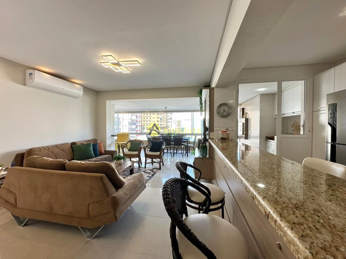 Apartamento mobiliado de alto padrão, localizado em esquina Norte-Leste, com vista definida para o mar e para a praça. Possui 128 m² de área privativa e 168,13 m² de área total. São três dormitórios, sendo uma suíte, living integrado com cozinha em conceito aberto, banho social, lavanderia separada e sacada com churrasqueira. O imóvel está totalmente mobiliado e climatizado, com ambientes amplos, iluminados e bem ventilados.