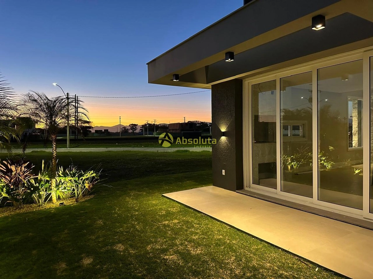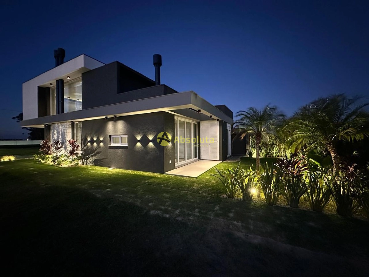 Casa térrea, 3 suítes, lavabo, living 53 m², sala com pé direito duplo, cozinha americana, piso porcelanato, esquadrias em PVC, água quente, gás central, espera p/ split, lareira a gás, jardinagem completa, iluminação, irrigação, localizada próximo ao clube, acabamentos em pedras naturais. Condomínio possui pórtico com guarida blindada, estacionamento para visitantes, deck com mirante, playground, ciclovia, quiosques, praça e quadras de esportes e lazer, club house com salão de festas, sala de jogos, baby care, sauna, academia, piscina adulta e infantil, prainha, horta comunitária, pomar, com segurança 24 horas.