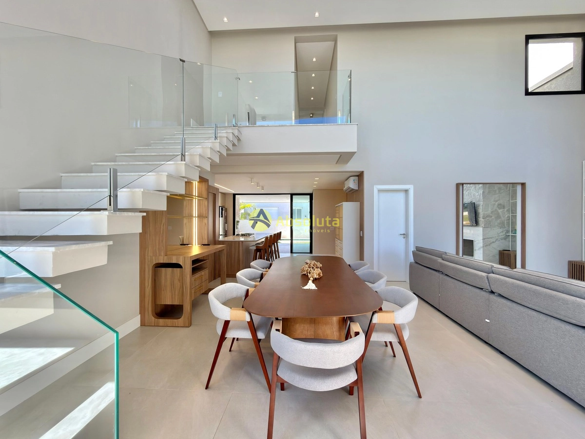 Sobrado todo mobiliado e decorado composto por 5 suítes de alto padrão com pisos em porcelanato em toda a casa, água quente, gás centralizado, ar-split, rica em detalhes, na parte inferior um gigantesco living em 03 ambientes, estar com lareira e pé direito duplo, mais espaço gourmet com cozinha estilo americano e churrasqueira, lavanderia separada, piscina, conta com uma suíte térrea e lavabo, na parte superior conta com sala de estar no mezanino e 03 suítes sendo duas com sacada e 01 suíte máster com banheira mais sacada de frente!