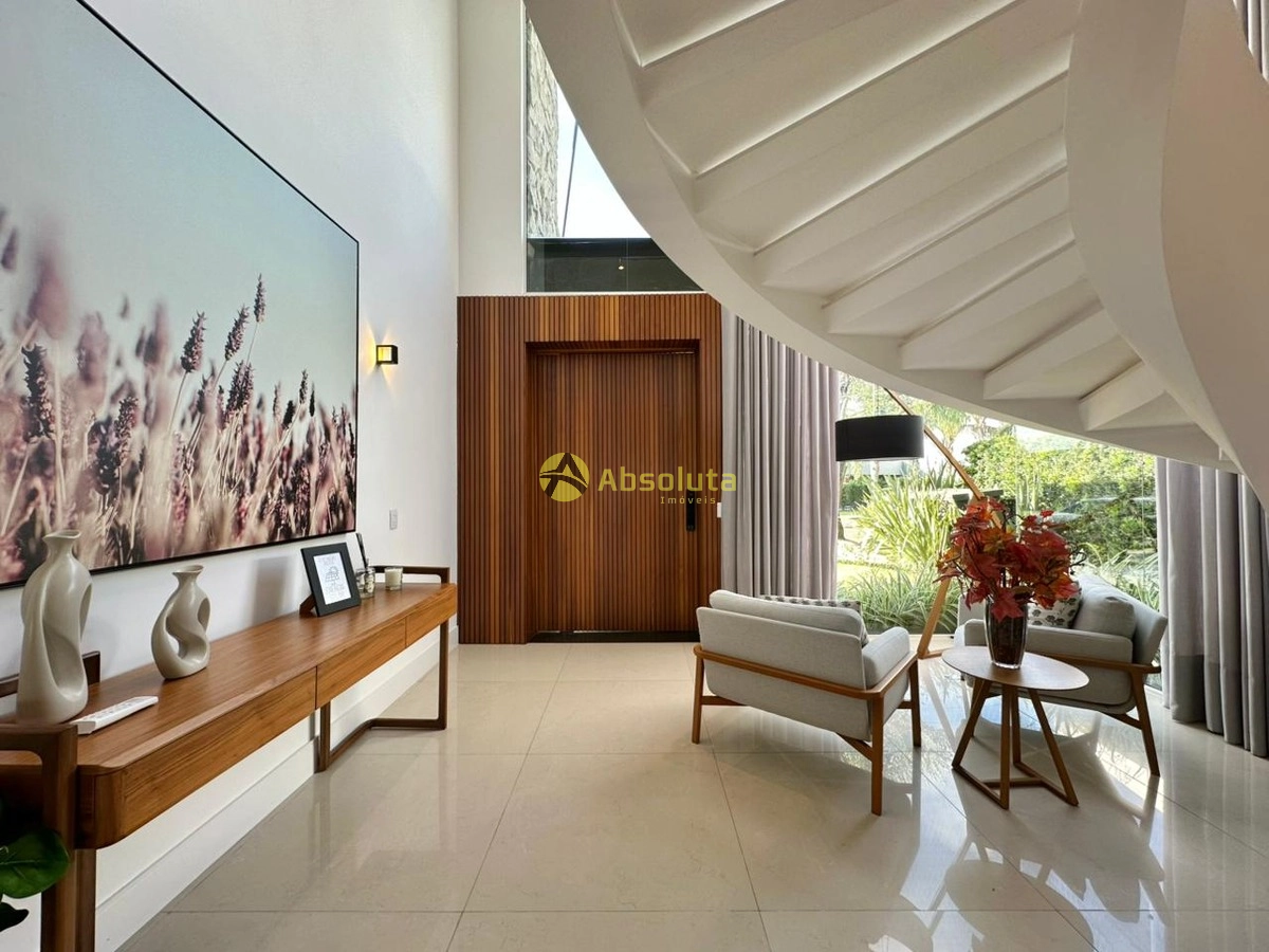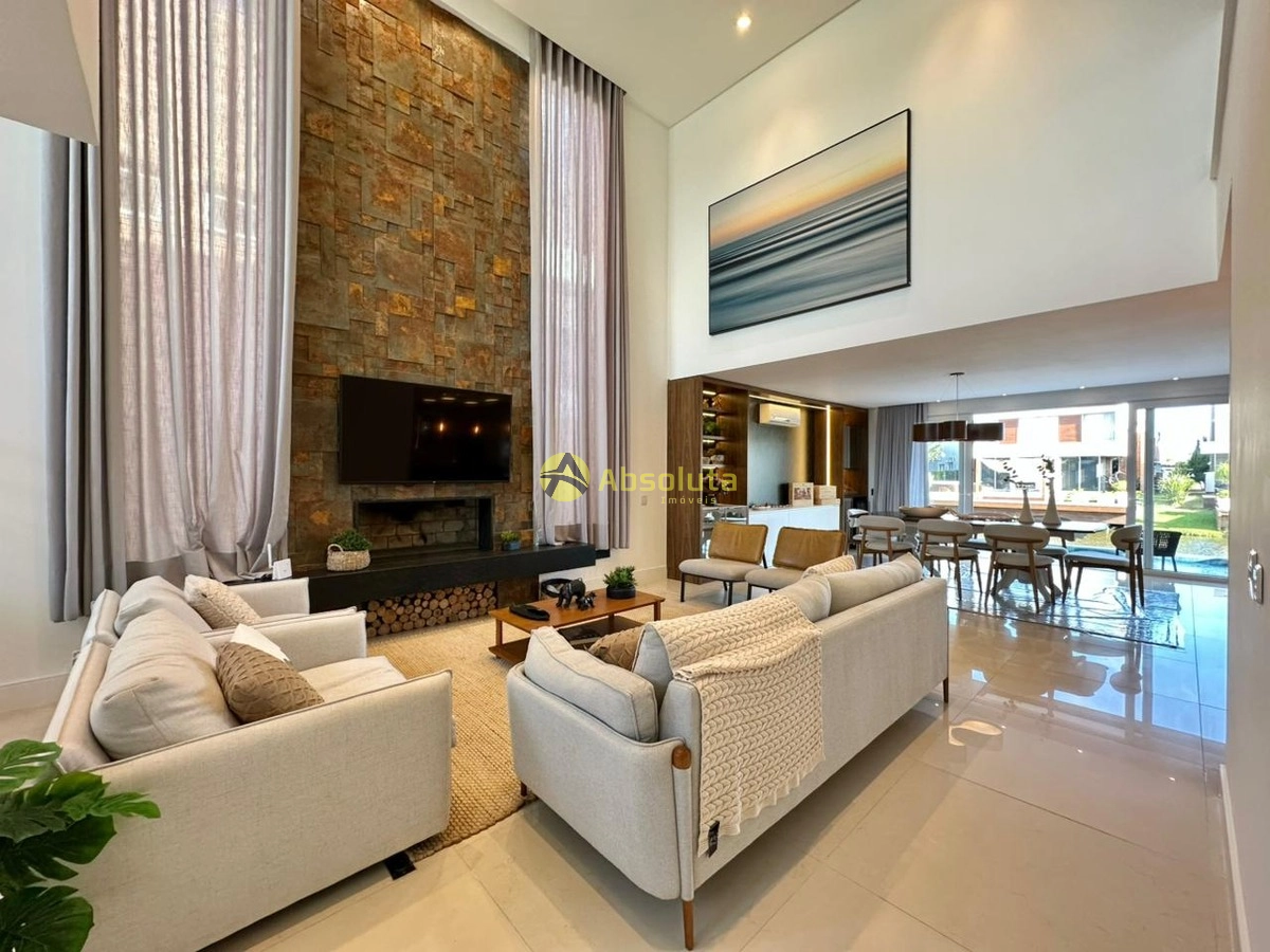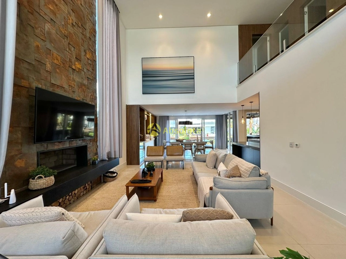 Sobrado finamente mobiliado e decorado composto por 5 suítes sendo uma suíte térrea com acessibilidade, uma suíte Master com banheira, living integrado, sala de estar com pé direito duplo, lavabo social, lavanderia ampla, cozinha equipada com anexo para um espaço gourmet externo com churrasqueira, piscina e deck de madeira suspenso sobre o lago. Abrigo para 2 carros, jardim com irrigação, esquadrias em PVC.